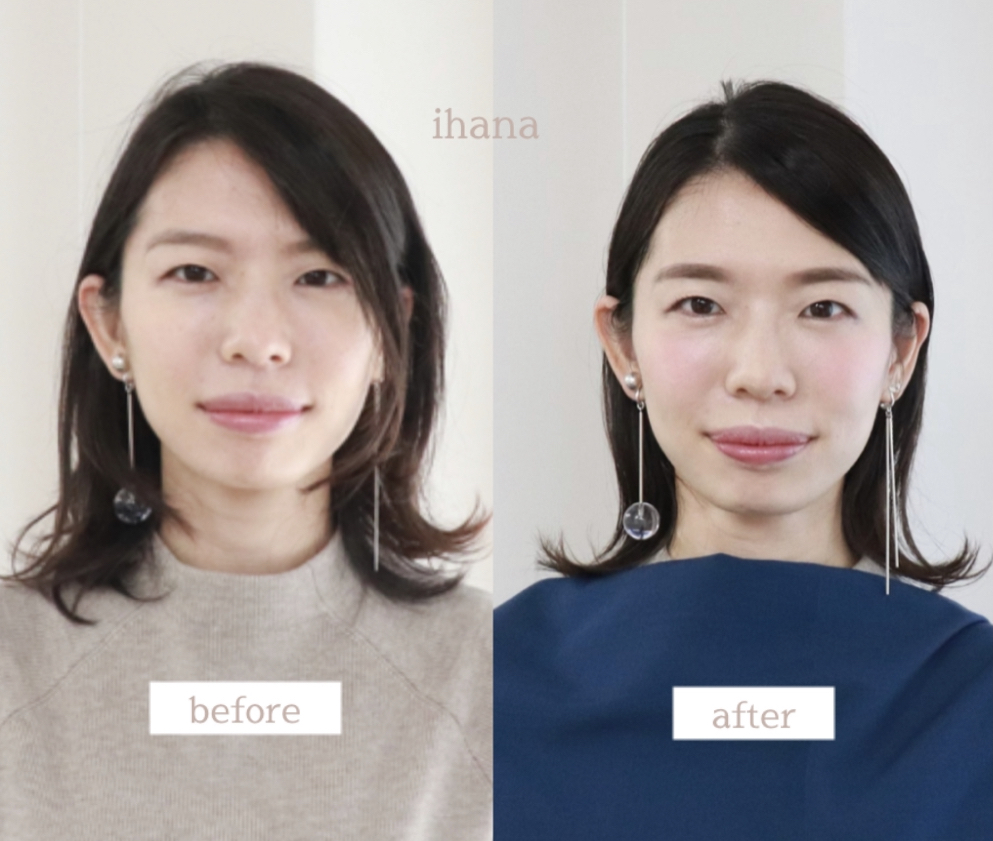 | ポイント | イハナのコンサルはただ診断を行うだけではありません。ご自身に今必要なこと、たとえばそれは呼吸法であったり、顔ヨガであったり、印象学の部分であったりします。お一人お一人に合わせた内容だからこそ、心から【自分のステキ】に気付いていただけます。軸を知った上でなりたいをプラスするメイクを。眉毛で凛とした意思と、唇で女性らしさを表現しました。 |